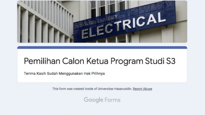Departemen Teknik Elektro Universitas Hasanuddin rabu 29 Juli 2020 mengadakan pemilihan ketua program studi S3 dengan cara e-vote. Pemilihan ini terdiri dari 3 Calon dan pemilih sebanyak 32 dosen tetap departemen teknik Elektro. Pemilihan diawali dengan pemaparan tentang visi, misi calon selama 10 menit, kemudian pada jam 11.00 - 13.00 WITA diadakan pemilhan secara online menggunakan google form. Pada pemilihan ini diperoleh dengan suara sebanyak 15 diperoleh oleh Andani Achmad, 14 surara oleh Faizal Arya Samman, dan 2 suara oleh Elyas Palantei dan 1 orang tidak memilih. Hasil rekap dengan 2 perolehan suara terbanyak nantinya akan diusulkan ke Rektor Universitas Hasasnuddin.