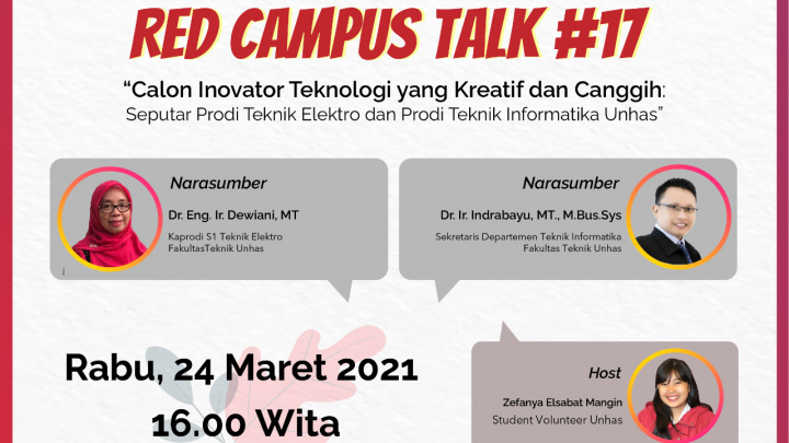 Rabu, 24 Maret 2021 kegiatan red campus talk edisi ke 17 kembali dilakukan pada kegiatan kali ini bertema "Calon Inovator Teknologi Yang Kreatif dan Canggih". Pada kegiatan ini membahasa tentang Seputar Profdi Teknik Elektro dan Prodi Teknik Informatika, yang diwakili olhe Dr.Eng.Ir. Dewiani, M.T dari elektro dan Dr.Ir. Indrabayu, M.T, M.Bus,Sys. Red Campus Talk merupakan upaya memperkenalkan seluk-beluk program studi pada jenjang strata satu yang ada di Unhas. Saat ini, Unhas memiliki 67 program studi strata satu, dan 2 program studi vokasi atau sarjana terapan. Program ini hadir dalam rangka membantu calon mahasiswa memutuskan pilihan program studi, kegiatan menampilkan paparan singkat yang dikemas secara populer dan kasual, namun informatif.