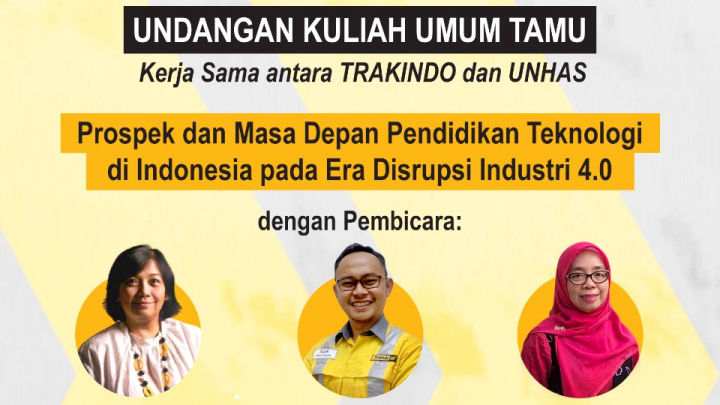 Pada sabtu 18 september 2021 telah diadakan kuliah umum tamu kerjasama antara TRAKINDO dan Univerisitas Hasanuddin dengan tema Prospek dan Masa Depan Pendidikan Teknologi di Indonesia pada Era Disrupsi Industri 4.0. Pada kuliah tamu ini terdapat 3 pemateri yaitu ibu Candy Sihombing (Corporate Communication and CSR Manager Trakindo), Fajar Nur Hendri Winarko (Instructor Technology Trakindo Tembagapura) dan Dewiani (Ketua Departemen Teknik Elektro). Materi kuliah tamu memberikan gambaran kepada mahasiswa tentang bagaimana perkembangan teknologi dan kebutuhan dalam dunia industri. Kerjasama antara TRAKINDO dan Universitas Hasanuddin diharapakan dapat meningkatkan hubungan antara universitas dan indutsri dalam meningkatkan kualiatas mahasiswa dan alumni.