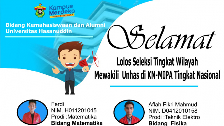 Kompetisi Nasional Matematika dan Ilmu Pengetahuan Alam (KN MIPA) merupakan kegiatan yang sangat strategis dan komprehensif untuk menghasilkan mahasiswa yang memiliki daya saing dan kompetensi unggul dalam bidang MIPA. Pada tahun 2021 ini salahsatu mahasiswa teknik elektro berhasil mewakili universitas hasanuddin pada bidang Fisika. Aflah Fikri Mahmud satu-satu mahasiswa yang mewakili dari fakultas teknik lolos pada seleksi tingkat wilayah mewakili Unhas di KN-MIPA tingkat Nasional 2021. Segenap civitas univeristas hasanuddin mengucapkan selamat berjuang ditahap selanjutnya.