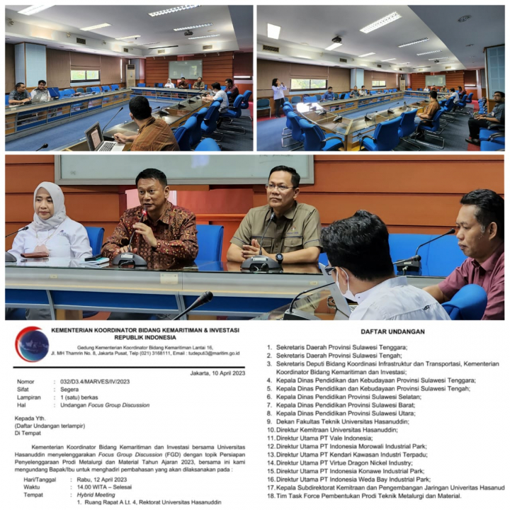 Fakultas Teknik Unhas (FTUH) melalui fasilitasi Wakil Rektor Bidang Kemitraan, Inovasi, Kewirausahaan dan Bisnis Universitas Hasanuddin (WR Bidang-4 Unhas), bekerjasama dengan Kementerian Koordinator Bidang Kemaritiman & Investasi (MenkoMarves) melakukan Focus Group Discussion (FGD) dalam rangka Persiapan Penyelenggaraan Prodi S1 Metalurgi & Material oleh FTUH. FGD ini dihadiri oleh para mitra Unhas dari Pemerintah Provinsi Sulawesi Tenggara & Sulawesi Tengah serta pihak industri pengelola pertambangan di wilayah tsb al. PT. VALE Indonesia, PT. Indonesia Marowali Industrial Park, PT. Virtue Dragon Nickel Industry, dll. Hadir sebagai Narsum FGD adalah Tim Deputi Koordinasi Bidang Infrastruktur & Transportasi MenkoMarves, dan Dekan FTUH serta Tim Pokja Pembukaan Prodi S1 Metalurgi & Material FTUH.