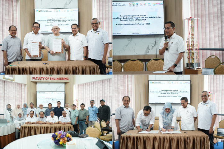 Fakultas Teknik Universitas Hasanuddin melaksanakan Penandatanganan Kontrak Pelaksanaan Kelas Berbahasa Inggris Semester Akhir Tahun Akademik 2025/2026 pada Senin, 23 Februari 2026, bertempat di Dean Hall, Gedung CoT Fakultas Teknik.