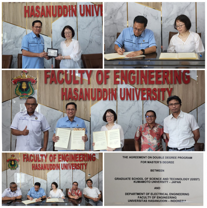 Kerjasama ini ditandai dengan Penandatangan Nota Kesepakatan Kerjasama untuk Double Degree bagi Program Magister dan Doktor yang dikelola kedua Pihak. Kesepakatan Kerjasama kedua Pihak ditandatangani oleh Dekan FT UNHAS, Prof. Muhammad Isran Ramli, dengan Dekan GSST Univ. Kumamoto, Prof. Fujimoto Hitoshi, secara Desk to Desk. Penandatangan Nota Kesepakatan oleh Dekan FT UNHAS dilakukan di Ruang Kerja Dekan FT UNHAS yang disaksikan oleh Prof. Mitsuyo Kishida, Ph.D, Deputy Vice-President for International Affairs GSST Kumamoto University. Turut hadir mendampingi Dekan FT UNHAS, Wakil Dekan Bidang Akademik dan Kemahasiswaan FT UNHAS, Ir. Ahmad Amil Ilham, Ph.D., Ketua Global Engagement Office (GEO) FT UNHAS, Dr.Eng. Muhammad Niswar, dan Penanggungjawab Kegiatan Kerjasama Double Degree DTE FTUH, Prof. Syafaruddin.