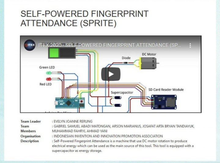 Untuk itu, SPRITE hadir sebagi inovasi mesin absensi sidik jari dengan memanfaatkan teknologi Self-Powered Dynamic System. Sehingga alat ini mampu mengkonversi energi kinetik berlebih menjadi energi yang digunakan untuk mendayai sistem itu sendiri.