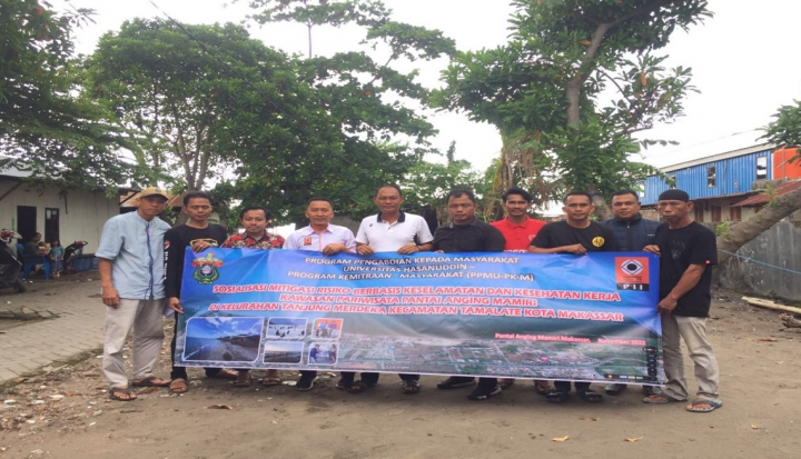 Sabtu, 26 November 2022-Departemen Teknik Kelautan Fakultas Teknik Universitas Hasanuddin bekerjasama dengan Bidang Kemaritiman Persatuan Insinyur Indonesia (PII) Cabang Makassar melakukan kegiatan “Sosialisasi Mitigasi Risiko Berbasis Keselamatan dan Kesehatan Kerja Kawasan Pariwisata Pantai Anging Mamiri di Kelurahan Tanjung Merdeka Kecamatan Tamalate Kota Makassar”. Kegiatan sosialisasi ini diikuti oleh Ketua dan anggota LPM Tanjung Merdeka, Wakil Pemerintah Kelurahan Tanjung Merdeka yang diwakili oleh Bapak Abd. Rahman (Ketua RW 05) dan Bapak J. Dg. Tantu (Ketua RT 02), perwakilan tokoh masyarakat dan organisasi kepemudaan Kelurahan Tanjung Merdeka, serta perwakilan pengelola Kawasan Wisata Pantai Anging Mamiri. Menurut Dr. Ir. Taufiqur Rachman, ST., MT., IPM., selaku koordinator kegiatan sosialisasi, minimnya rambu-rambu peringatan dini tentang Keselamatan dan Kesehatan Kerja (K3) dan bencana yang ada di kawasan wisata Pantai Anging Mamiri ini sehingga kurang mengedukasi pengunjung wisata melalui pemahaman rambu-rambu peringatan dini K3 dan bencana. Dengan adanya sosialisasi ini, diharapkan dapat meningkatkan kewaspadaan dan pemahaman pengunjung terhadap potensi kecelakaan dan bencana yang dapat terjadi di lokasi wisata, sehingga jika terjadi bencana korban dapat diminimalisir. Sosialasi tentang pentingnya pembekalan tanggap mitigasi risiko berbasis K3 dan bencana yang harus dipenuhi oleh pengelola wisata dalam pelaksanaan aktifitas wisata bahari. Tata kelola mitigasi risiko berbasis K3 di kawasan wisata Pantai Anging Mamiri ini berfokus pada masyarakat (people-centered) yang melibatkan semua pihak, seperti pelaku usaha wisata, Organisasi Perangkat Daerah (OPD) dan masyarakat lokal yang diwakili oleh Lembaga Pemberdayaan Masyarakat (TPM) Tanjung Merdeka, pengunjung wisata, dan Pemerintah Kecamatan Tamalate. Sosialisasi ini dilakukan untuk memberi pemahaman pentingnya pembekalan tanggap bencana dan mitigasi risiko keselamatan pengunjung wisata yang harus dipenuhi oleh pengelola wisata bahari, sesuai dengan UU No.1 Tahun 1970 tentang Keselamatan Kerja. Sosialisasi ini juga menegaskan pentingnya area sempadan pantai guna melindungi fasilitas kawasan wisata dan permukiman masyarakat setempat jika seandainya terjadi bencana, dengan mengacu pada UU No.11 tahun 2020 tentang Cipta Kerja dan Permen Lingkungan Hidup No. 5 tahun 2012.