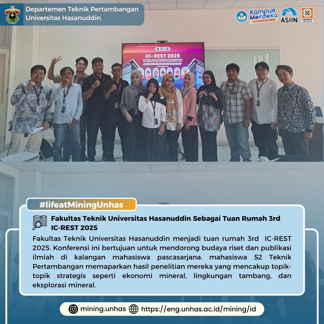 Pada tanggal 27 Agustus 2025, Fakultas Teknik Universitas Hasanuddin menjadi tuan rumah 3rd International Conference on Research in Engineering and Science Technology (IC-REST 2025). Acara ini diikuti oleh mahasiswa dari berbagai program studi, termasuk mahasiswa Program Magister Teknik Pertambangan yang turut ambil bagian secara aktif.