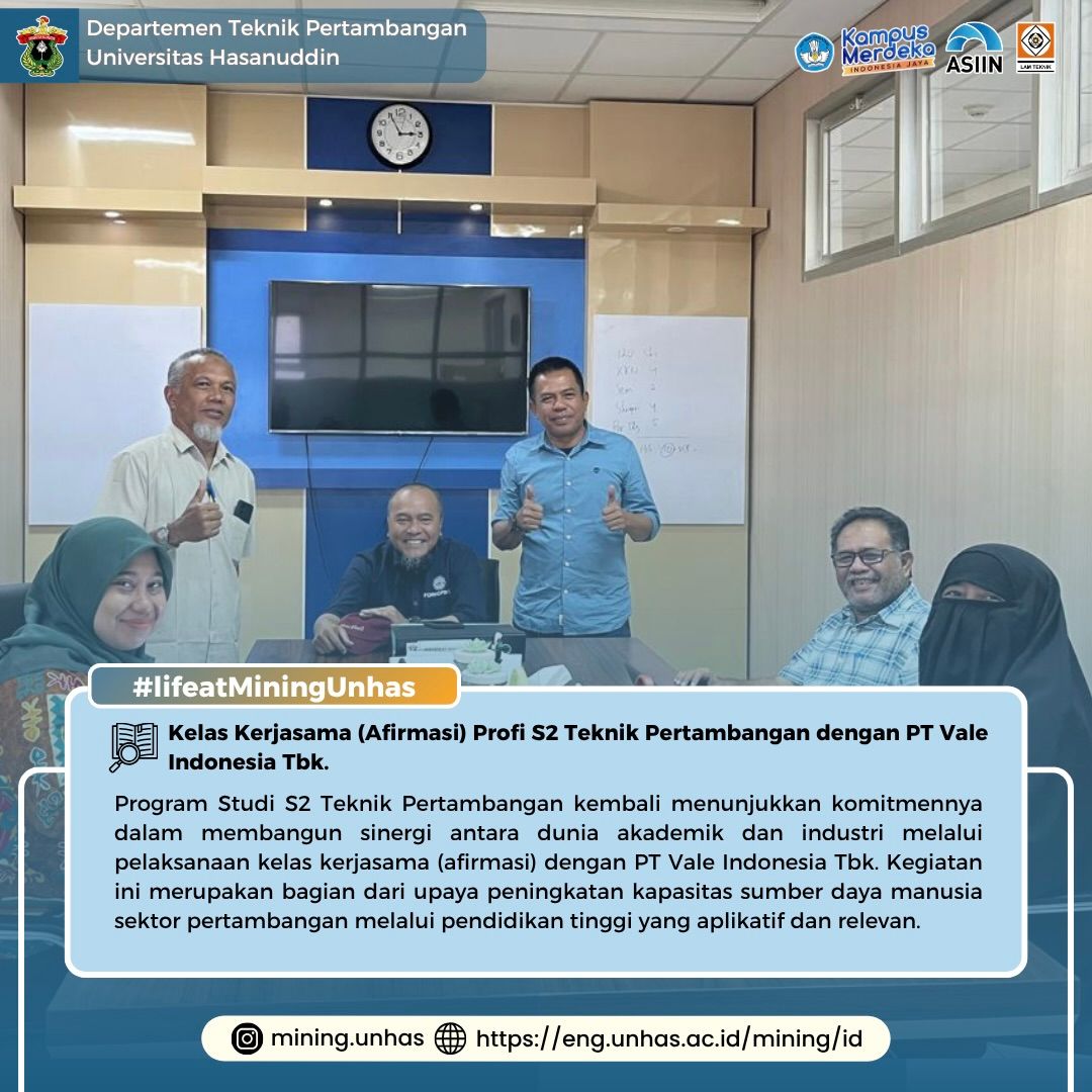 Kelas kerjasama ini diharapkan menjadi model kolaborasi berkelanjutan antara Unhas dan PT Vale Indonesia Tbk, serta memperkuat posisi Program Studi S2 Teknik Pertambangan sebagai mitra strategis dalam pengembangan ilmu dan teknologi pertambangan di Indonesia.