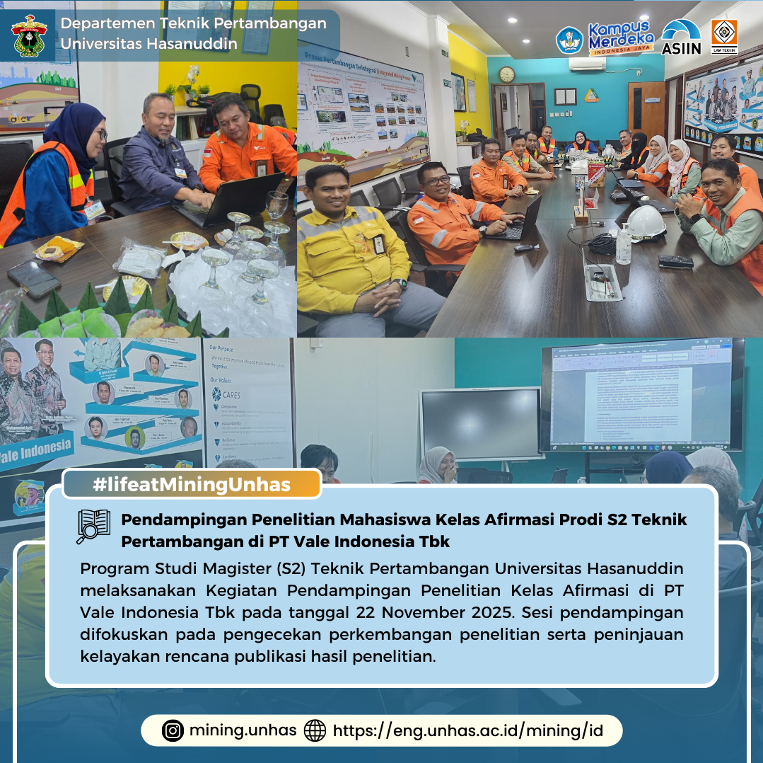 Program Studi Magister (S2) Teknik Pertambangan Universitas Hasanuddin melaksanakan Kegiatan Pendampingan Penelitian Kelas Afirmasi di PT Vale Indonesia Tbk pada tanggal 22 November 2025. Kegiatan ini bertujuan untuk memastikan kelancaran proses penelitian mahasiswa, di mana dalam kegiatan tersebut, para mahasiswa Kelas Afirmasi mendapatkan pendampingan langsung dari masing-masing dosen pembimbing. Sesi pendampingan difokuskan pada pengecekan perkembangan penelitian serta peninjauan kelayakan rencana publikasi hasil penelitian. Melalui interaksi langsung antara mahasiswa dan pembimbing, kegiatan ini diharapkan dapat meningkatkan kualitas output riset sekaligus mempercepat capaian studi mahasiswa.