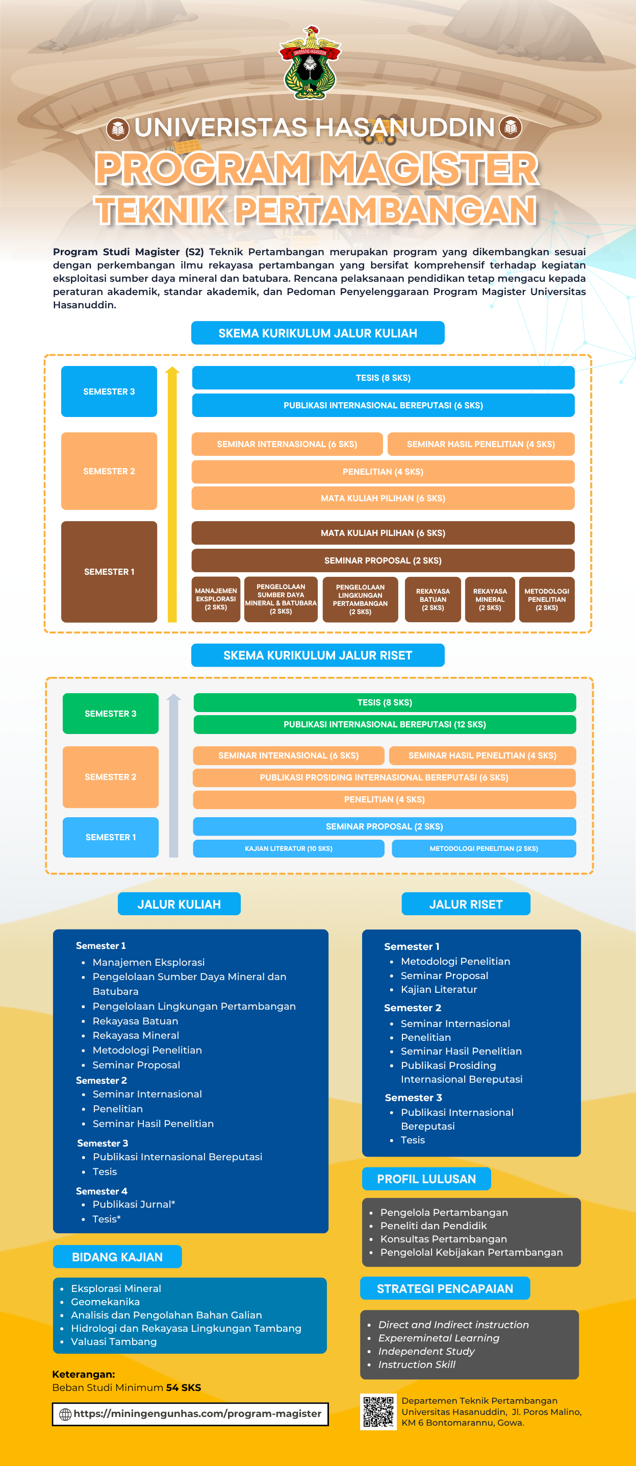 Program Studi Magister (S2) Teknik Pertambangan merupakan program yang dikembangkan sesuai dengan perkembangan ilmu rekayasa pertambangan yang bersifat komprehensif terhadap kegiatan eksploitasi sumber daya mineral dan batubara. Rencana pelaksanaan pendidikan tetap mengacu kepada peraturan akademik, standar akademik, dan Pedoman Penyelenggaraan Program Magister Universitas Hasanuddin.